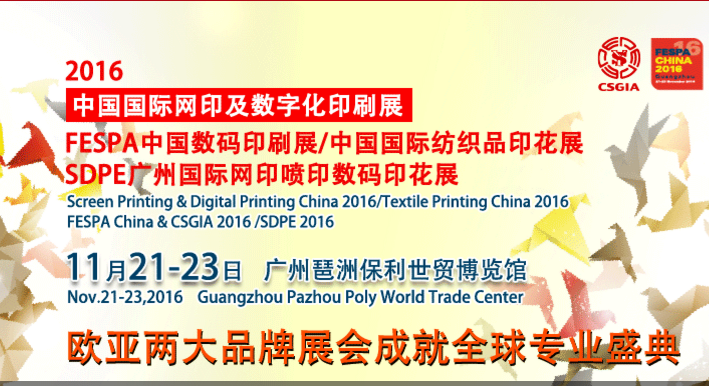 迈入第三十个年头的“2016中国国际网印及数字化印刷展/FESPA中国数码印刷展/中国国际纺织品印花展/SDPE广州国际网印喷印数码印花展”将于11月21—23日在广州琶洲保利世贸博览馆隆重上演。作为亚洲地区最具影响力的行业大展,历经过去三十年的成长,展会已成为中国目前规模最大、参与人数最多、影响力最广、国际化程度最高的博览会,已连续多年吸引大量海外展商。展会由中国网印及制像协会、广州粤展展览有限公司主承办。目前已有600多家国内外优秀企业参加本次展会。